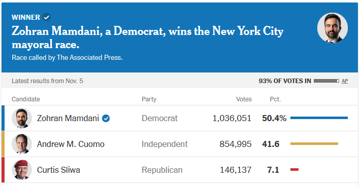 Mamdani did not really run as any sort of radical, despite the frenzied media depictions of him as one, not to mention Cuomo's racist attacks against him as some sort of Islamic fanatic. In some respects, Mamdani's campaign had similarities to the more center-left Democrats in Virginia and New Jersey that I talked about above, such as a relentless focus on the cost of living and affordability. He was very much on message about this, to the point where I, a casual observer of this election, can tell you that one of his major proposals was making universal childcare a reality in New York City.